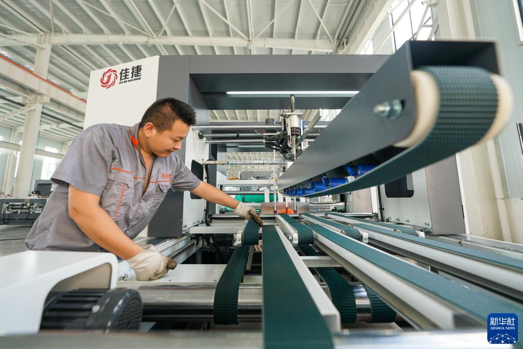 7月13日,河北省玉田縣一家印刷包裝機(jī)械制造企業(yè)的工人在調(diào)試產(chǎn)品。