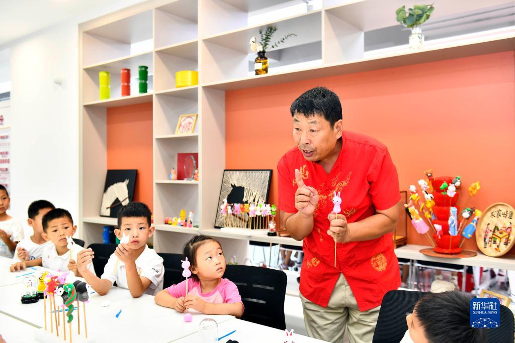 7月13日,在惠民縣姜樓鎮(zhèn)一處“濱濱學(xué)堂”,公益講師劉延貴教孩子們面塑知識。