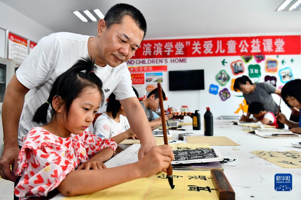 7月13日,在惠民縣胡集鎮一處“濱濱學堂”,公益講師常春輝教孩子們練習書法。
