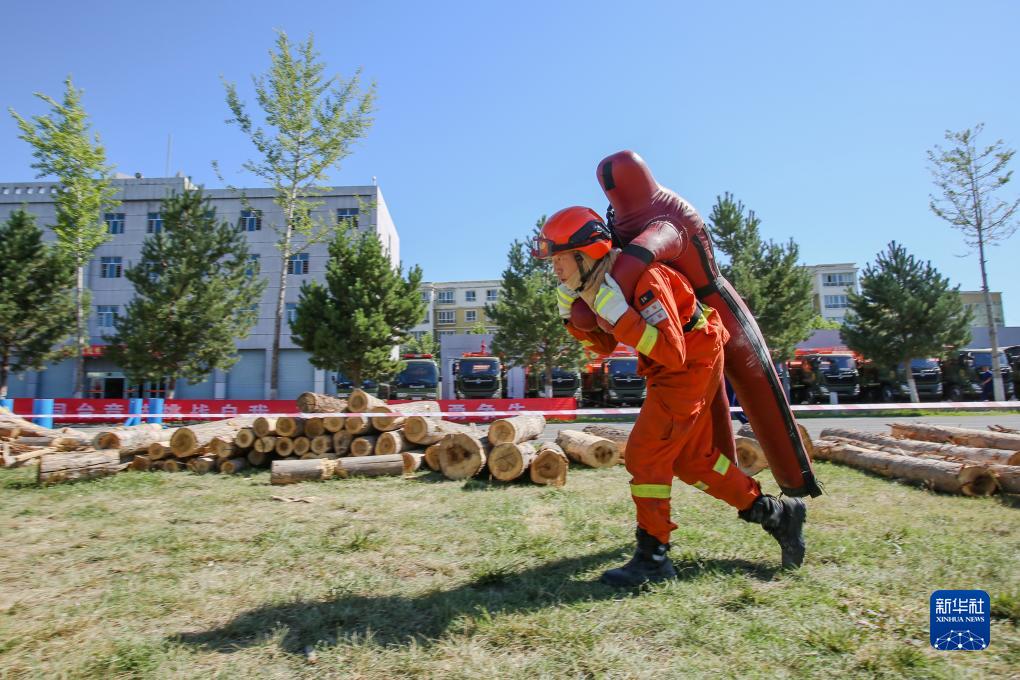 7月13日,一名消防員在專業(yè)技能大比武中模擬救治傷員。