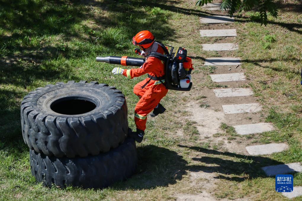 7月13日,一名消防員在專業技能大比武中模擬進入避難場所。