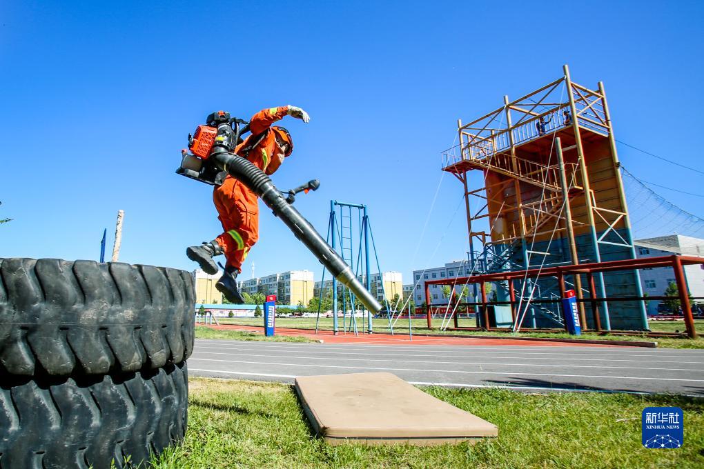 7月13日,一名消防員在專業技能大比武中向下一個目標點沖刺。