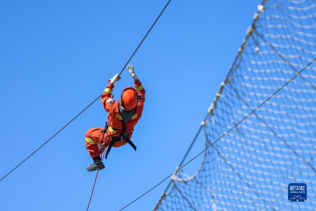 7月13日,一名消防員在專業技能大比武中模擬山岳救援。