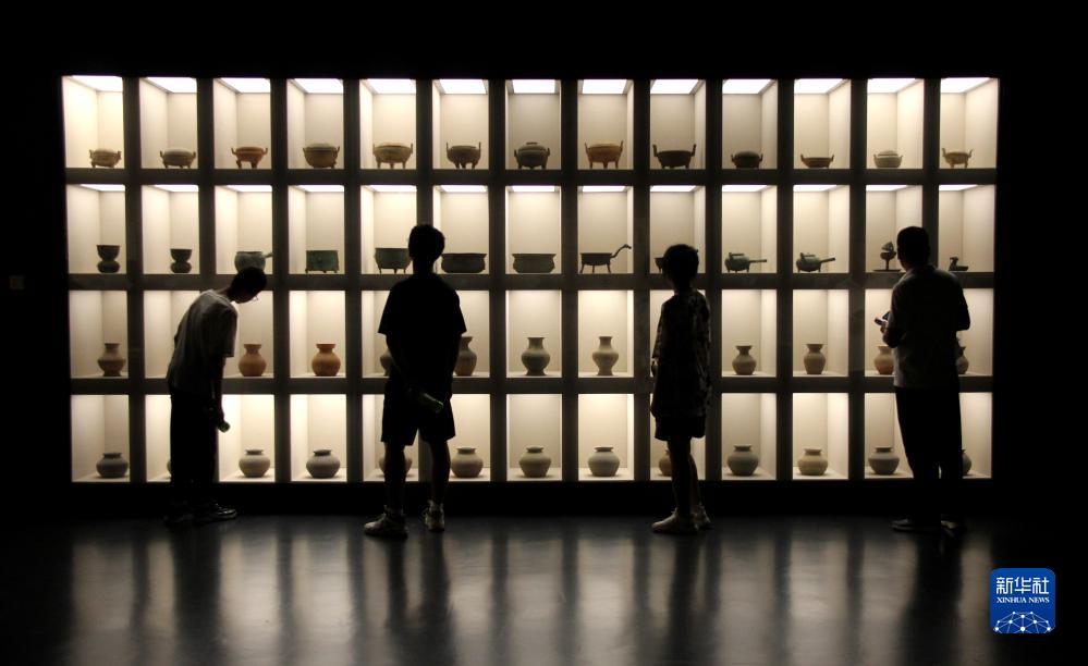 7月13日,在山東省滕州市博物館,幾名學生(左一至三)在觀看出土的文物。