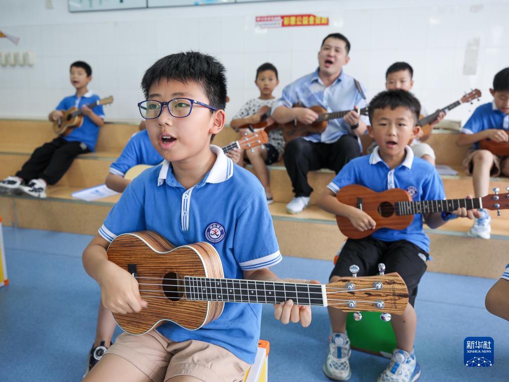 7月13日,河南省安陽市高新區銀杏小學南校學生在暑期延時服務課上彈奏尤克里里。