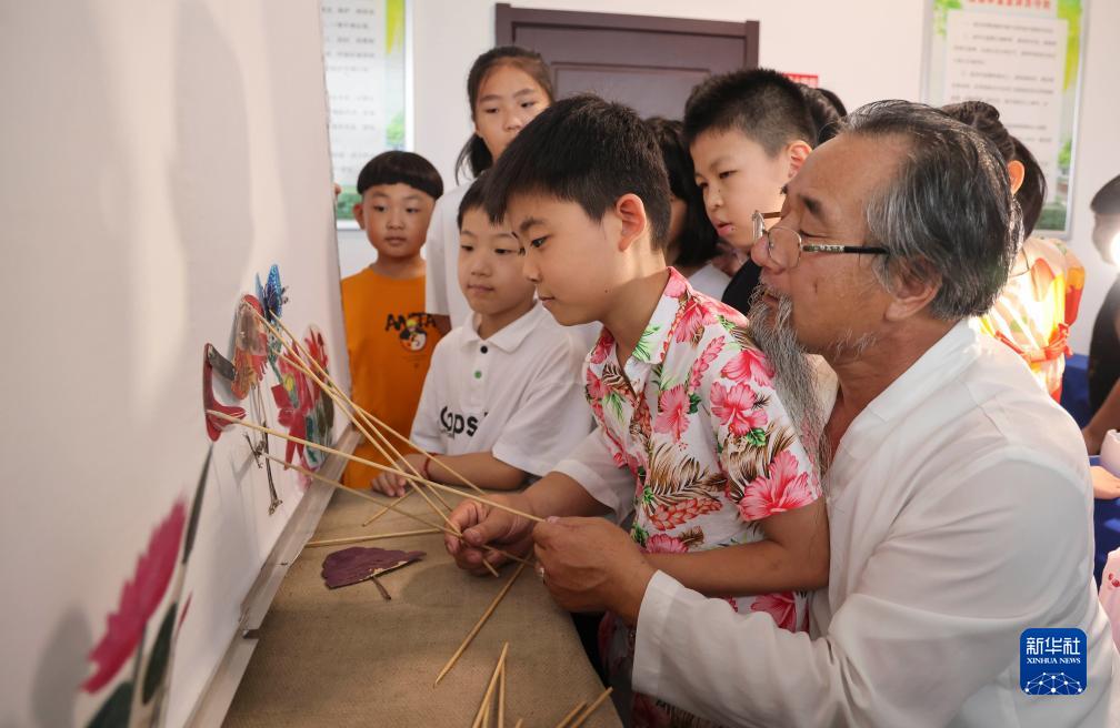 7月13日,在山東省臨沂市蘭山區銀雀山街道三合屯社區,孩子們在民間藝人的指導下體驗皮影戲。