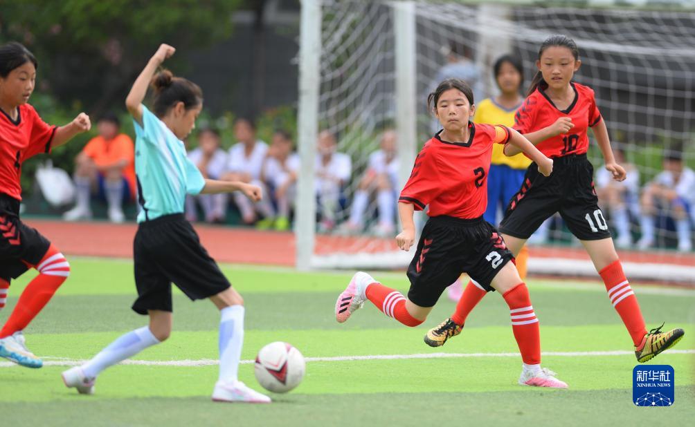 7月13日,在山東省滕州市實(shí)驗(yàn)小學(xué)文化路校區(qū),參加滕州市第七屆校園足球聯(lián)賽的孩子們在球場上拼搶。