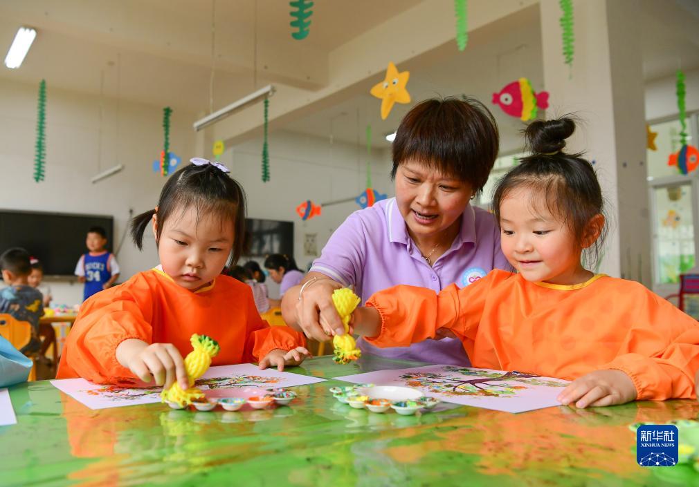 7月13日,在安徽省合肥市肥西縣山南鎮中心幼兒園,小朋友在老師的指導下作畫。