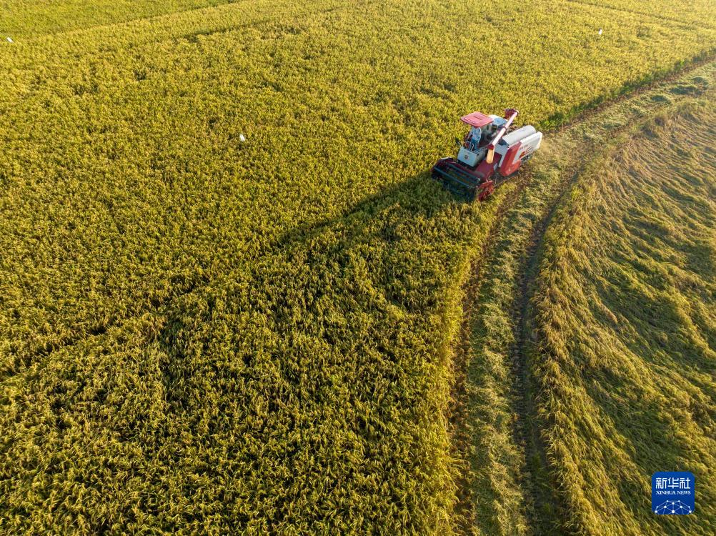 7月12日,在永州市道縣蚣壩鎮(zhèn)光家?guī)X村,農(nóng)民駕駛機(jī)械收割早稻(無人機(jī)照片)。