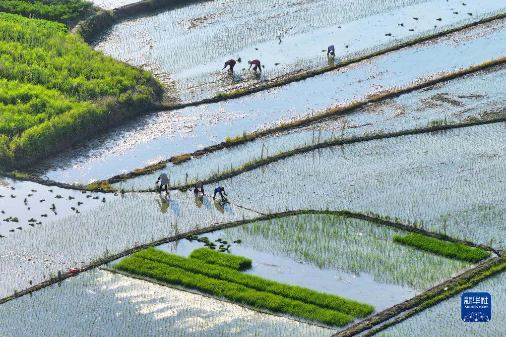 7月11日,在衡陽市衡東縣吳集鎮楊梓坪村,村民在插晚稻(無人機照片)。