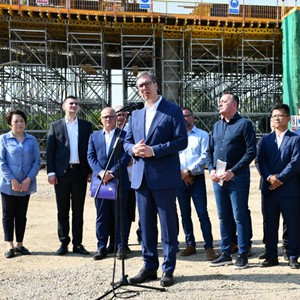 7月12日,在塞爾維亞?wèn)|部城市波扎雷瓦茨,塞爾維亞總統(tǒng)武契奇(前)在視察中企承建的波扎雷瓦茨至戈盧巴茨快速路施工現(xiàn)場(chǎng)時(shí)講話。