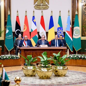 7月13日,埃及總統(tǒng)塞西(中)在埃及開羅舉行的蘇丹鄰國峰會上講話。