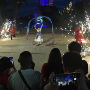 7月13日晚,游客在開封市萬歲山大宋武俠城景區內觀看文藝表演。