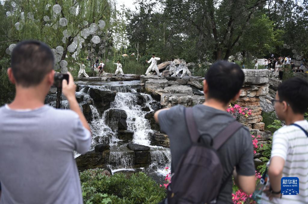 7月13日,游客在開封市萬歲山大宋武俠城景區內觀賞武術表演。