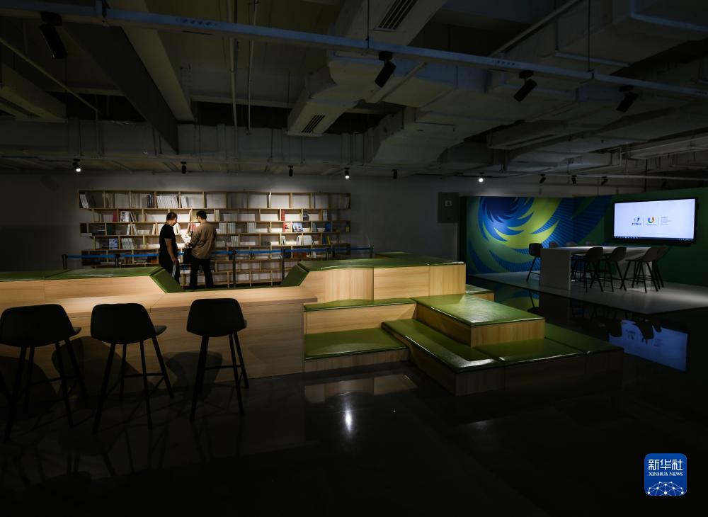 7月13日,在成都大運會主媒體中心的休閑娛樂區,兩名媒體記者在翻閱圖書。