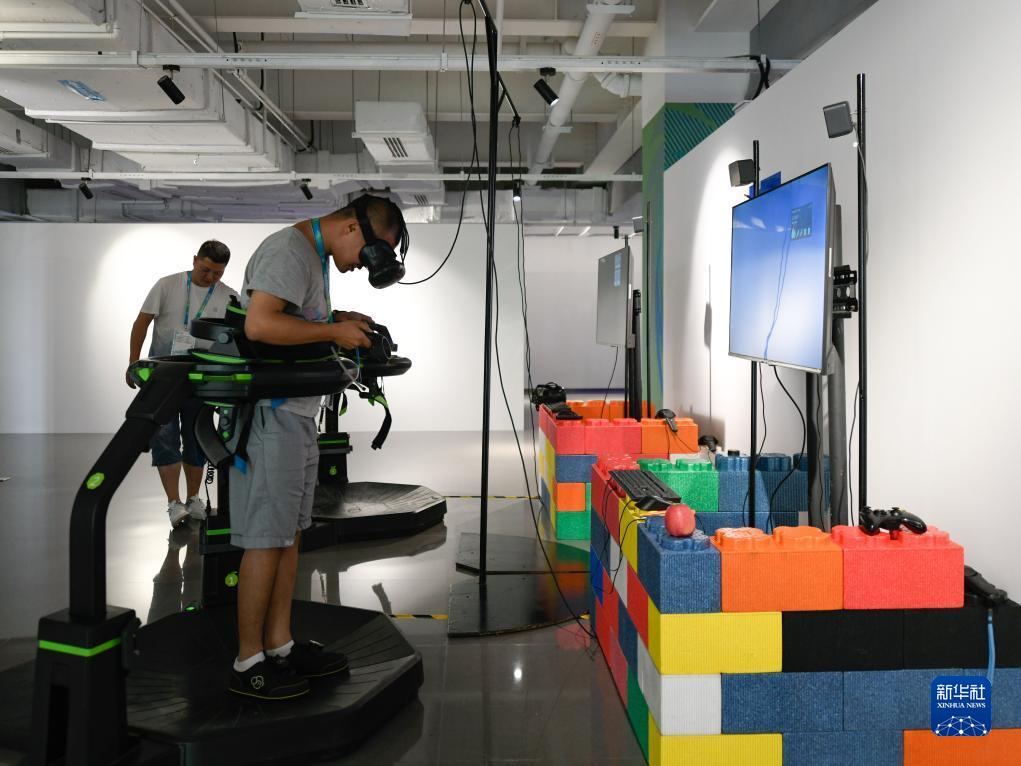 7月14日,媒體工作人員在成都大運會主媒體中心休閑娛樂區(qū)內(nèi)體驗VR游戲。