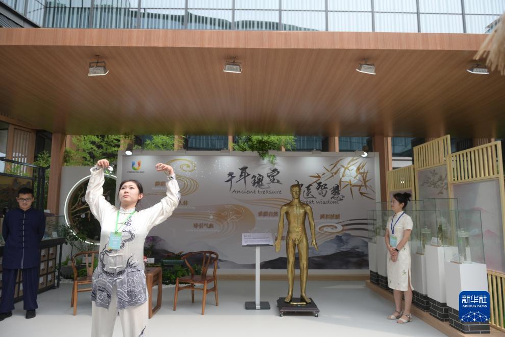 這是7月12日拍攝的主媒體中心傳統文化傳播區內的中醫文化展示區。