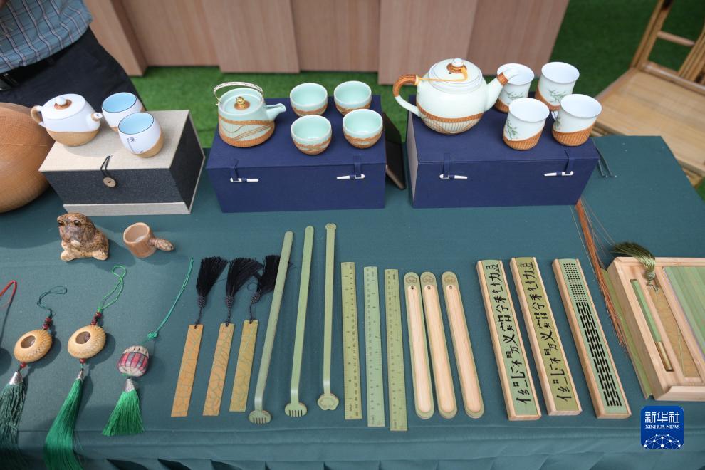 這是7月12日拍攝的主媒體中心傳統文化傳播區的四川竹編產品展示。