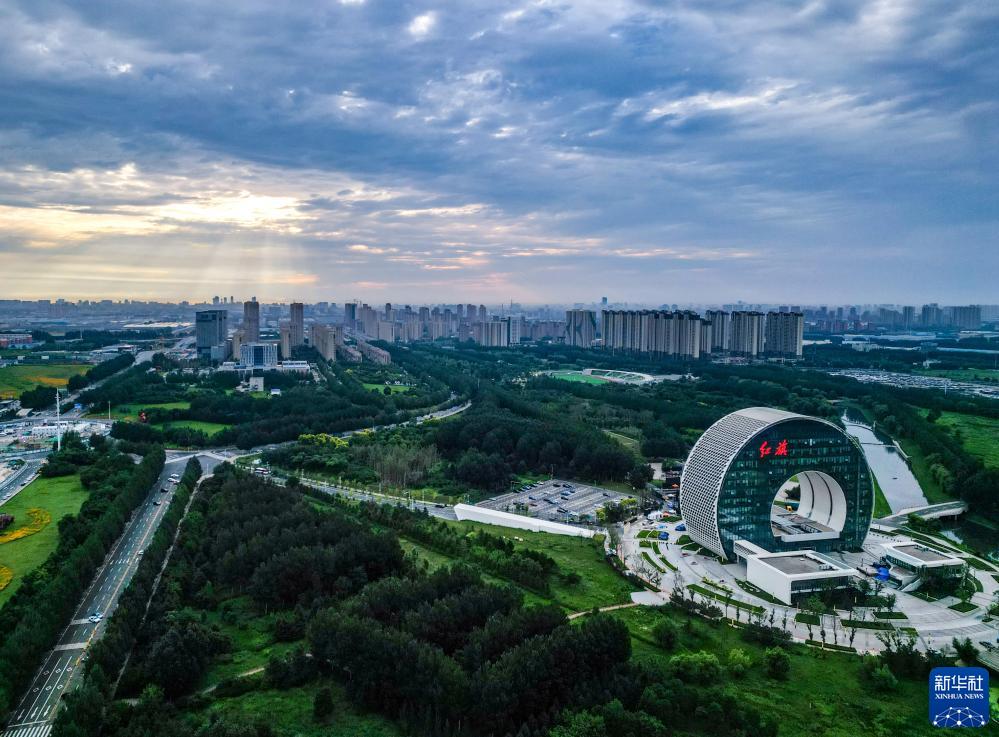 7月13日無(wú)人機(jī)拍攝的晨曦中的一汽紅旗創(chuàng)新大廈。