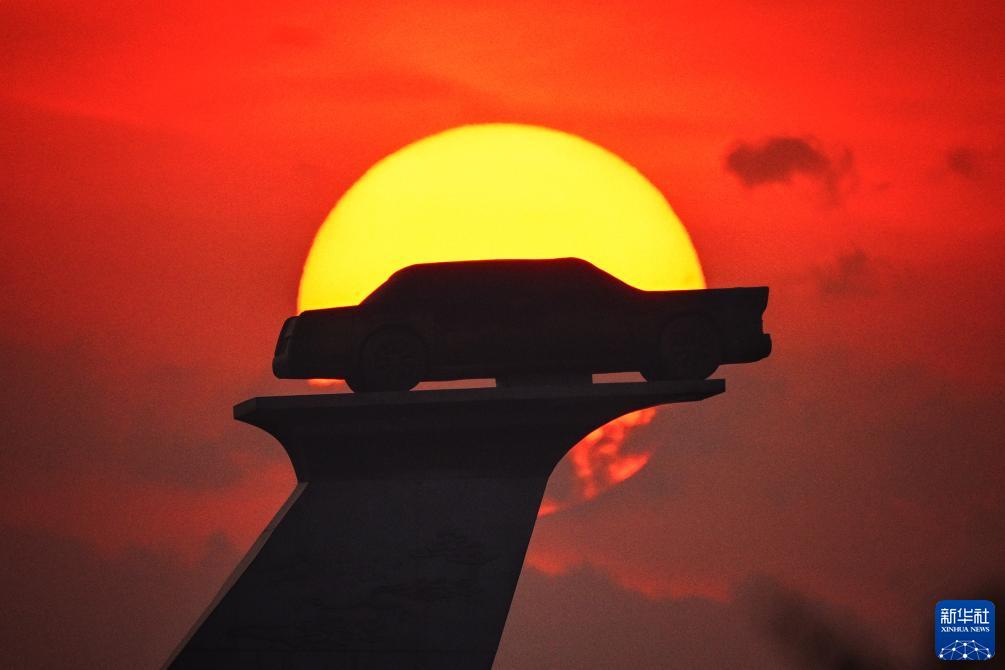 長春市汽車廣場內的汽車雕塑沐浴在晨曦中(6月17日攝)。