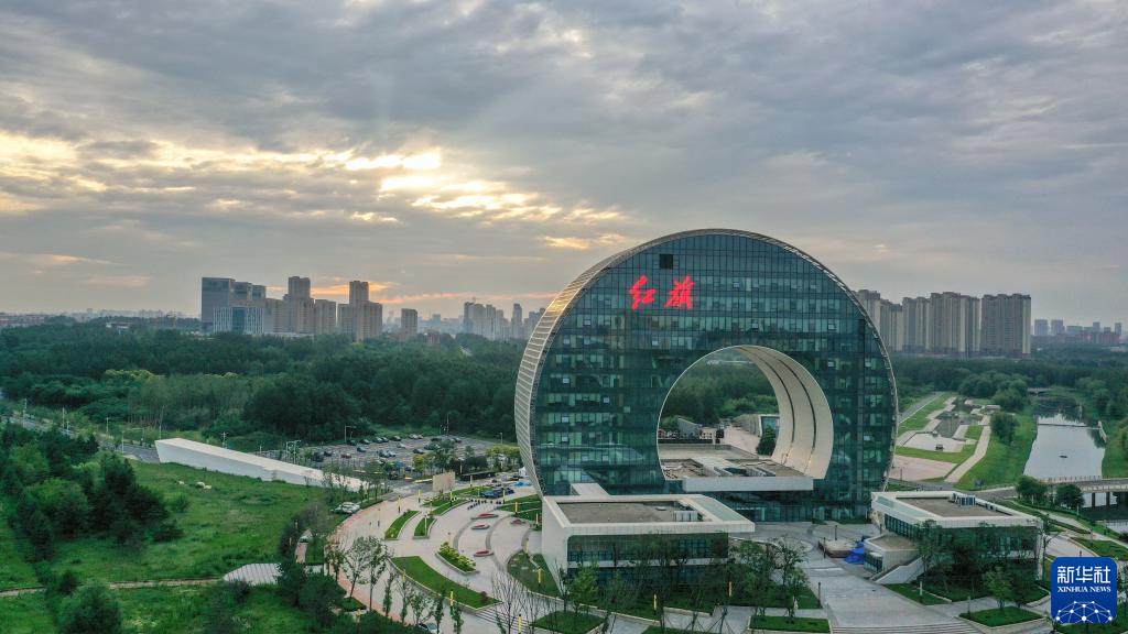 7月13日無人機拍攝的晨曦中的一汽紅旗創(chuàng)新大廈。