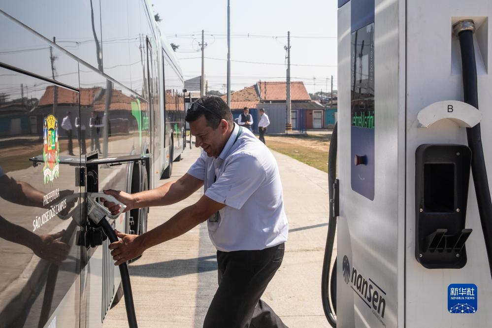 7月12日,在巴西圣保羅州圣若澤杜斯坎普斯,工作人員為比亞迪純電動大巴充電。