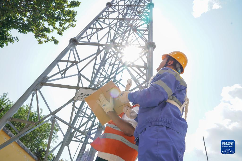 7月11日,在哈齊高鐵1號基站,魏巍(右)在上塔前與防護員曹學(xué)明確認作業(yè)要點。