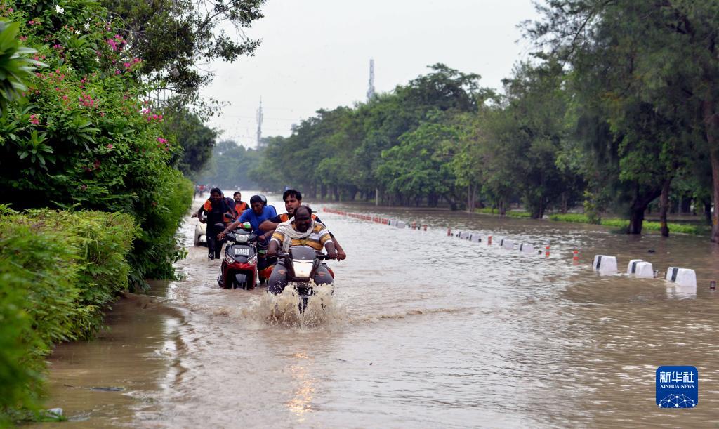7月13日,人們在印度新德里被淹沒的道路上涉水前行。