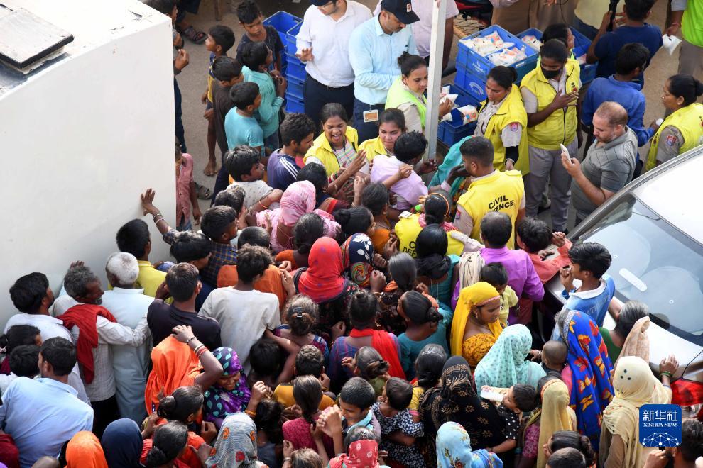 7月13日,在印度新德里,生活受到水災影響的居民領取生活物資。
