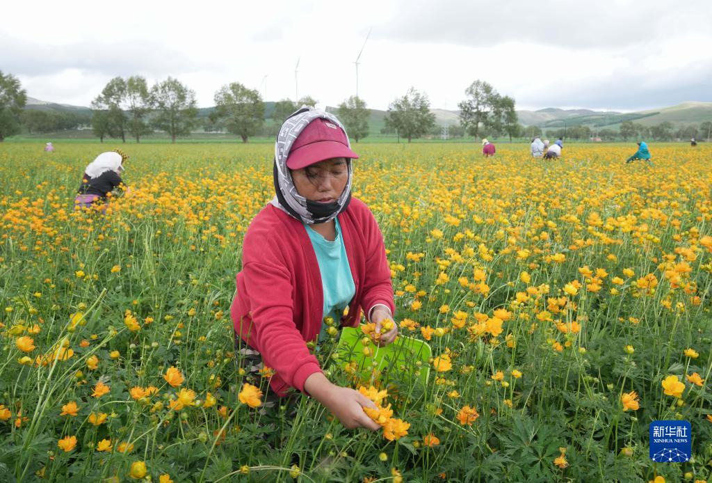 7月14日,河北省沽源縣長梁鄉興隆堡村金蓮花種植合作社的社員在田間采摘金蓮花。
