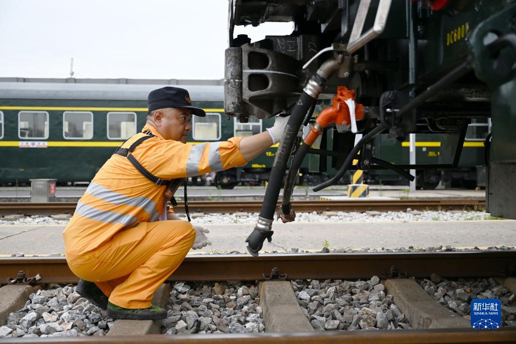 7月13日,合肥火車站運轉車間調車長李健在調試車輛制動軟管。