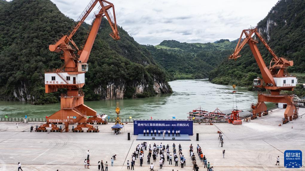 7月14日,貴州烏江集裝箱航線首航儀式在貴州省遵義市余慶縣沙灣碼頭舉行(無人機照片)。