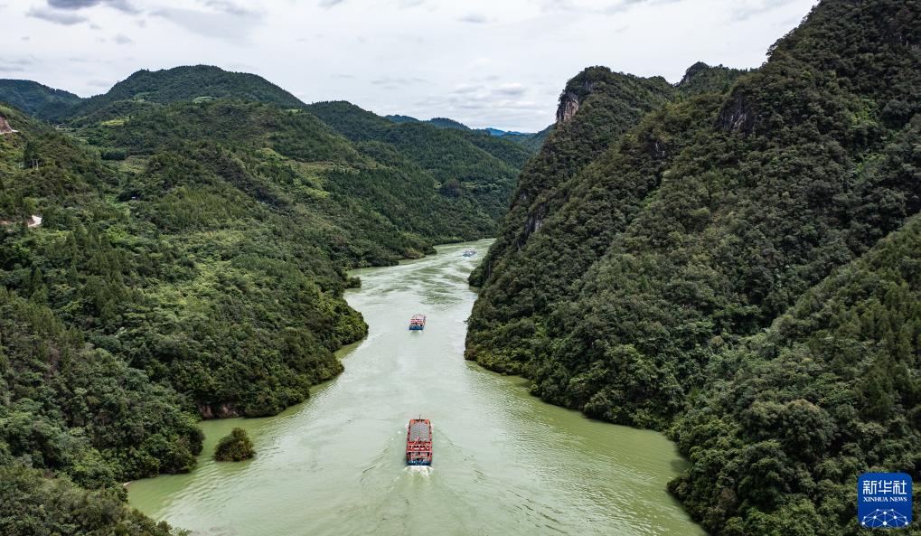 集裝箱貨輪從貴州省遵義市余慶縣沙灣碼頭駛出,前往重慶涪陵黃旗港(7月14日攝,無人機照片)。