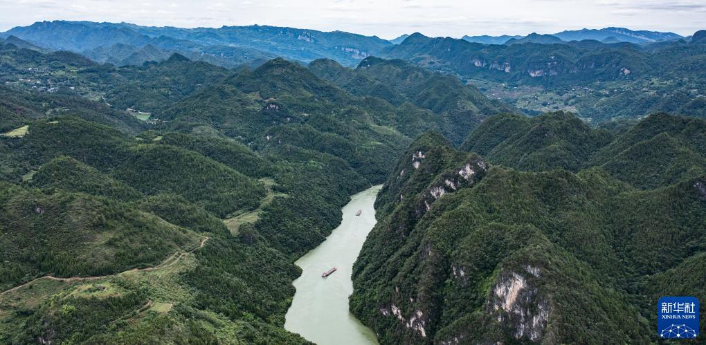 集裝箱貨輪從貴州省遵義市余慶縣沙灣碼頭駛出,前往重慶涪陵黃旗港(7月14日攝,無人機照片)。