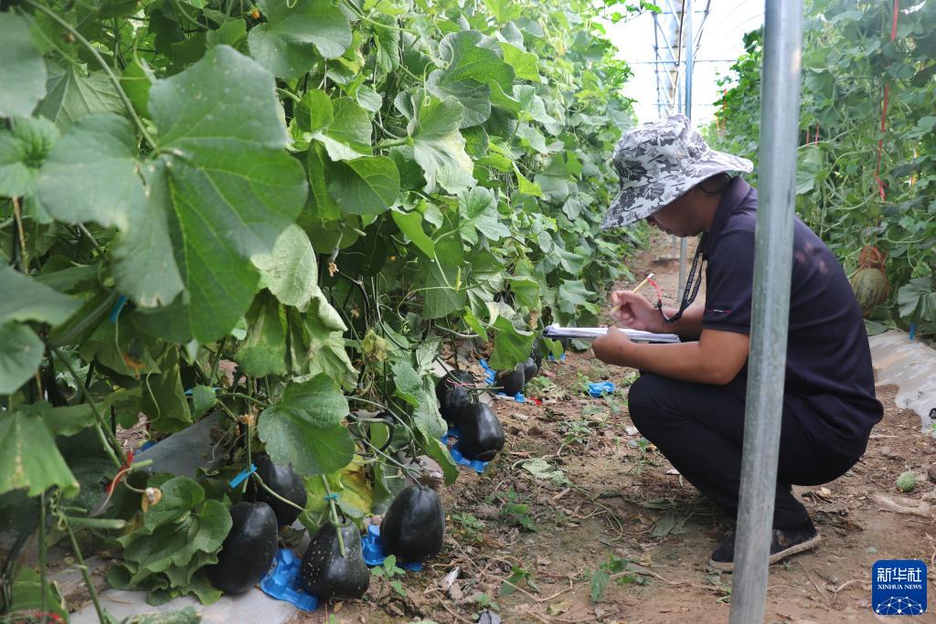 7月14日,科研人員在進(jìn)行甜瓜資源田間數(shù)據(jù)調(diào)查。