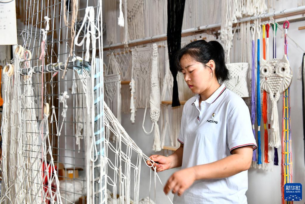 7月14日,在惠民縣姜樓鎮(zhèn)史官莊堡村,村民在編織繩網(wǎng)工藝產(chǎn)品。