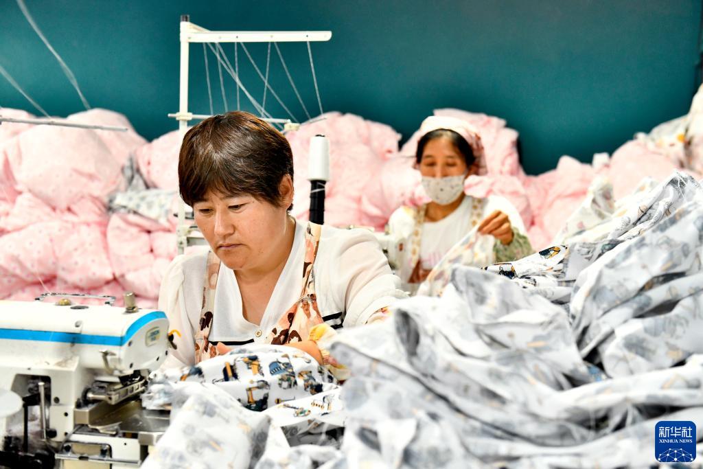 7月14日,在惠民縣胡集鎮(zhèn)河?xùn)|村,村民在加工床笠。