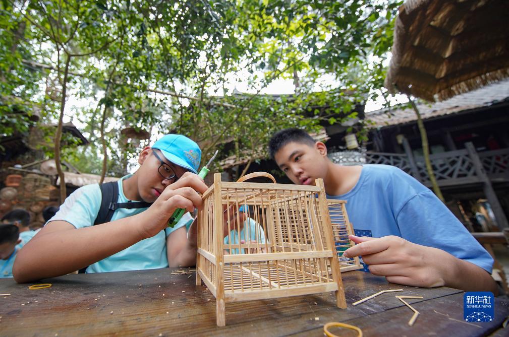 7月14日,學(xué)生在貴州省黔東南苗族侗族自治州丹寨縣龍泉鎮(zhèn)卡拉村體驗鳥籠編制技藝。