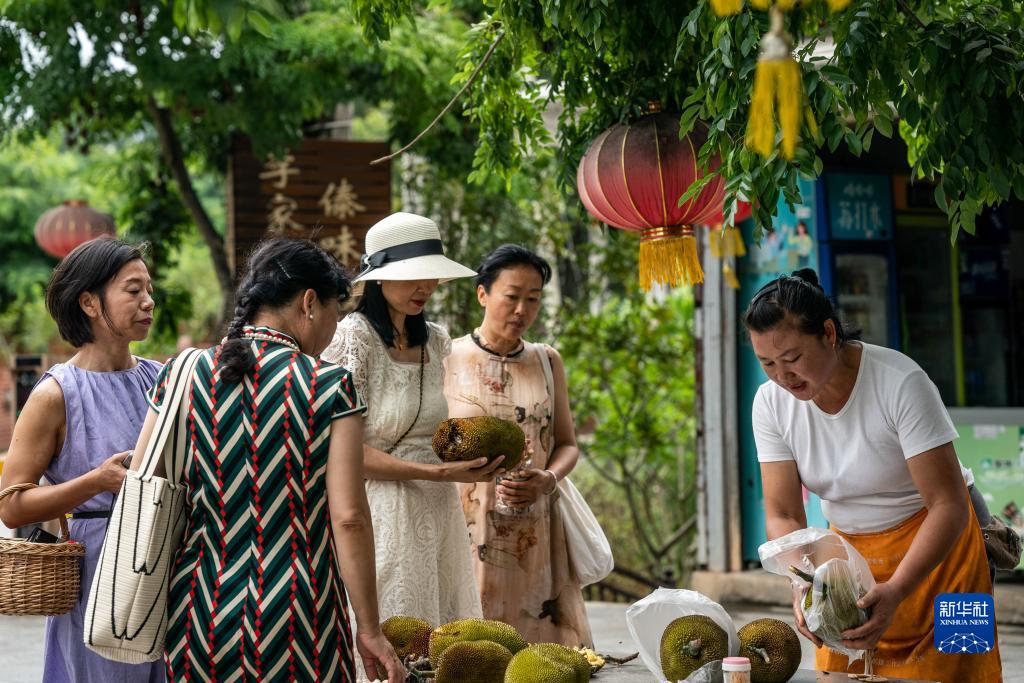 7月14日,游客在云南省德宏傣族景頗族自治州芒市風(fēng)平鎮(zhèn)帕底村介桃村民小組購買菠蘿蜜。