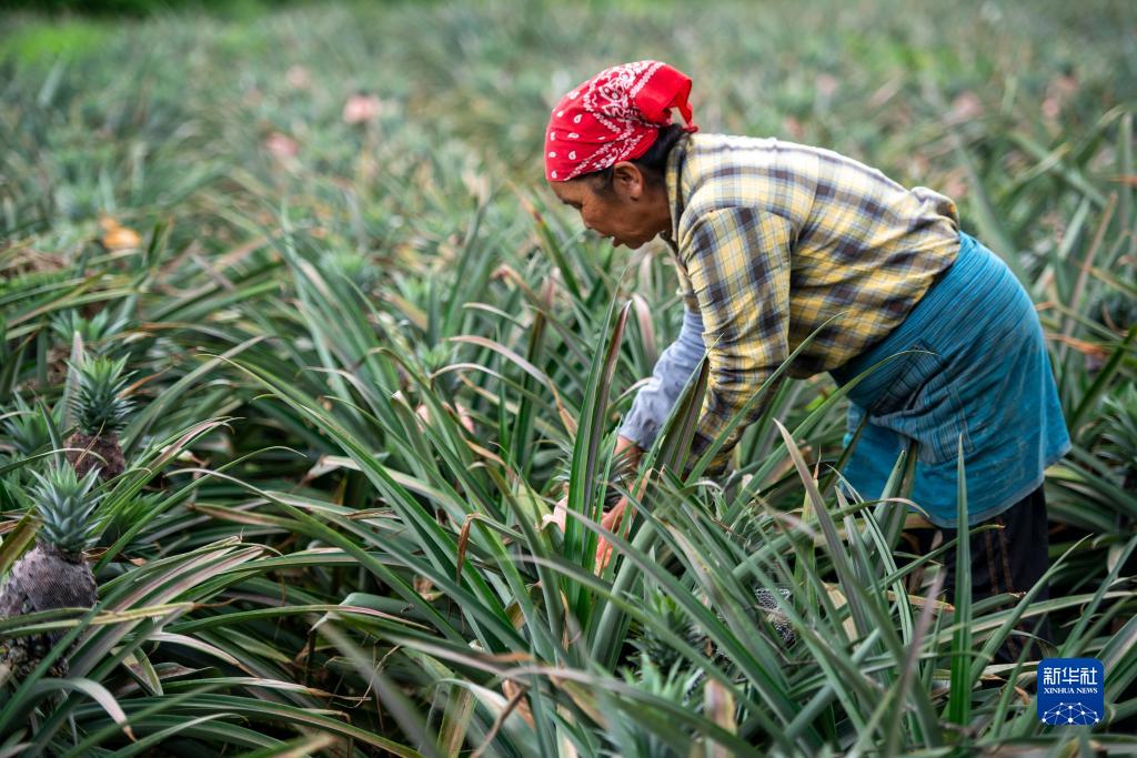 7月14日,在云南省德宏傣族景頗族自治州芒市風平鎮帕底村介桃村民小組,一名村民在菠蘿地里干農活。