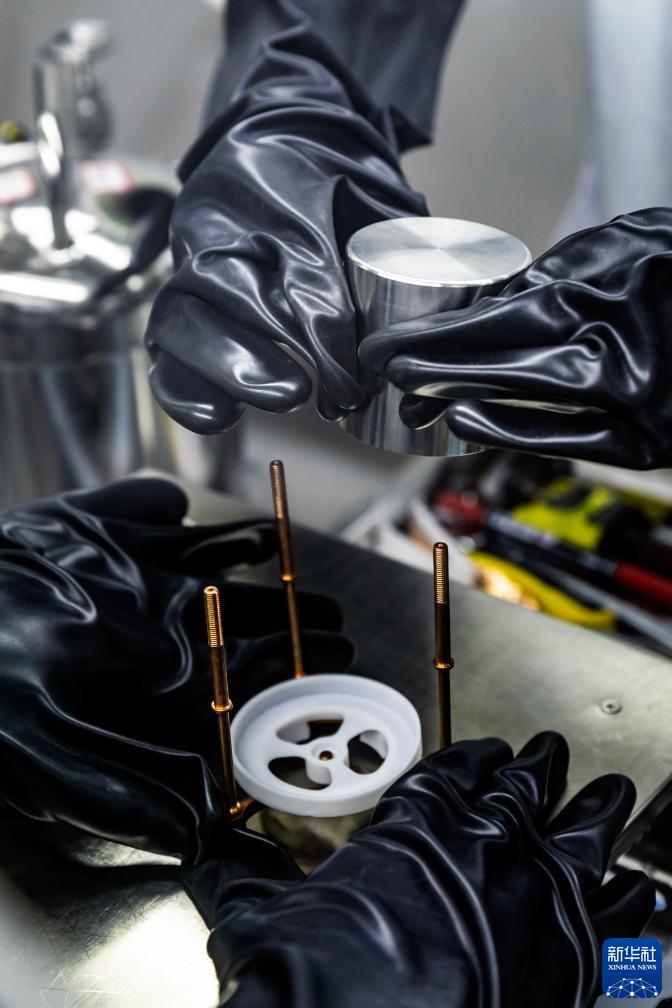 7月3日,在中國錦屏地下實驗室,實驗組成員利用模擬裝置,訓練裝配1公斤級高純鍺探測器,為開展第三代百公斤級高純鍺暗物質實驗做準備。新華社記者 沈伯韓 攝