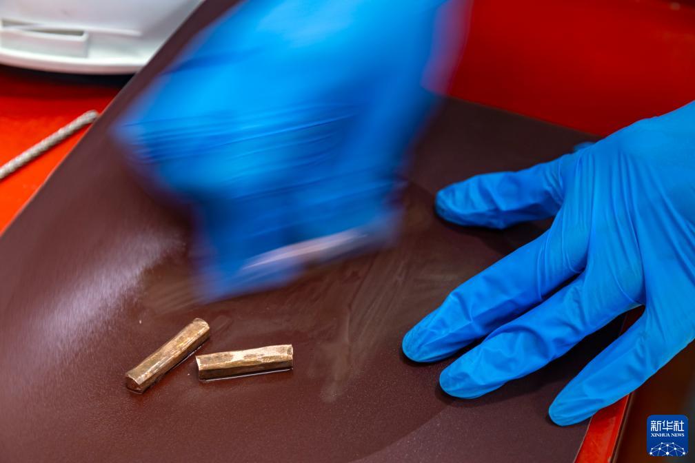 7月3日,在中國錦屏地下實驗室,實驗組成員對準備采購的銅樣品進行本底輻射檢測。這是在檢測前打磨銅樣品的氧化層。新華社記者 沈伯韓 攝