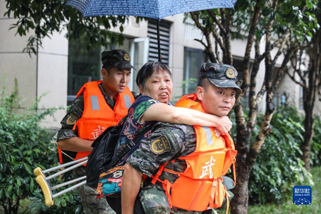 7月14日,在重慶市萬(wàn)州區(qū)江南新區(qū),武警重慶總隊(duì)執(zhí)勤第三支隊(duì)官兵在轉(zhuǎn)移群眾。