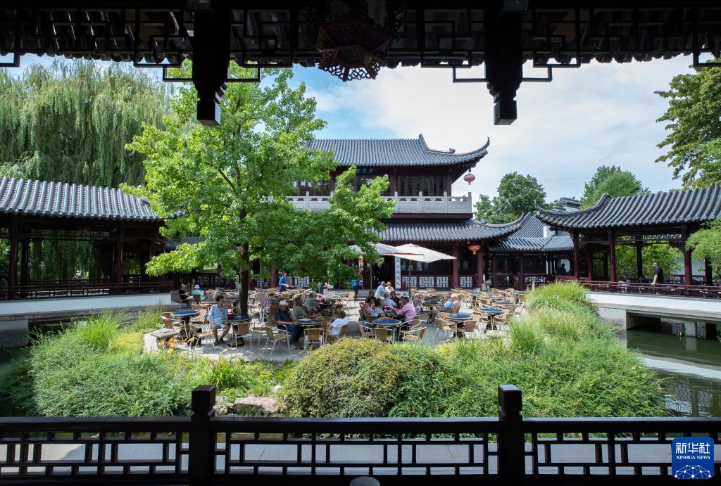 7月14日,在德國曼海姆的路易森公園內的中國園林“多景園”,游客在茶樓喝茶。