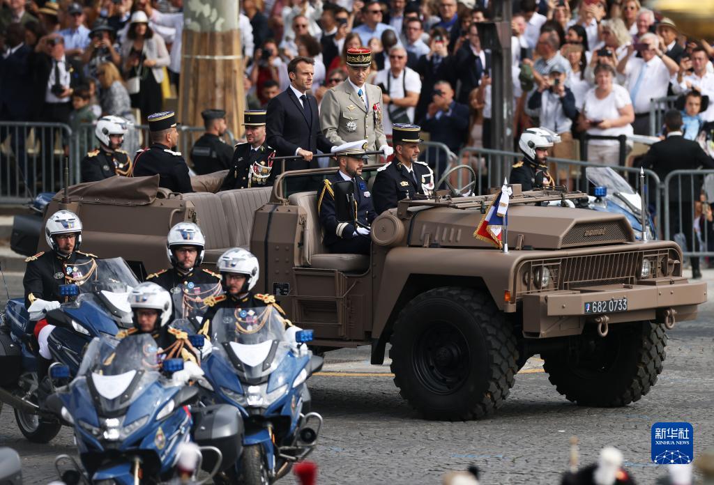 7月14日,法國總統(tǒng)馬克龍抵達(dá)巴黎協(xié)和廣場的國慶閱兵式現(xiàn)場。新華社記者 高靜 攝