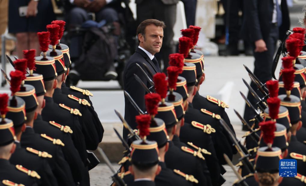 7月14日,法國總統(tǒng)馬克龍在巴黎協(xié)和廣場的國慶閱兵式現(xiàn)場檢閱儀仗隊。新華社記者 高靜 攝