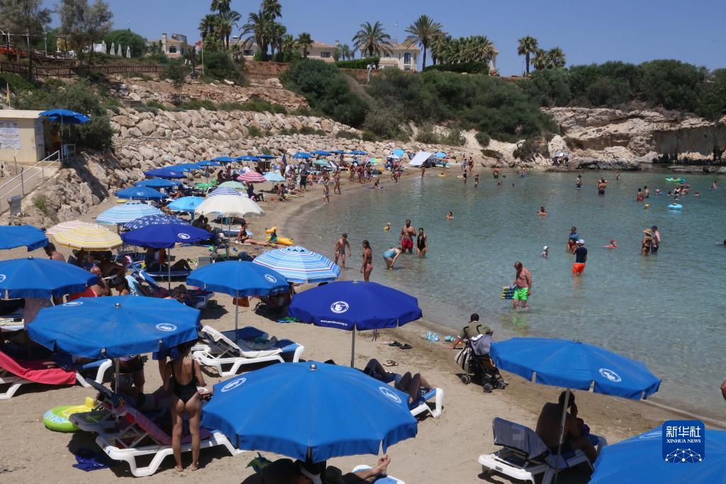 7月14日,人們在塞浦路斯普羅塔拉斯的海邊消暑。新華社記者 郭明芳 攝