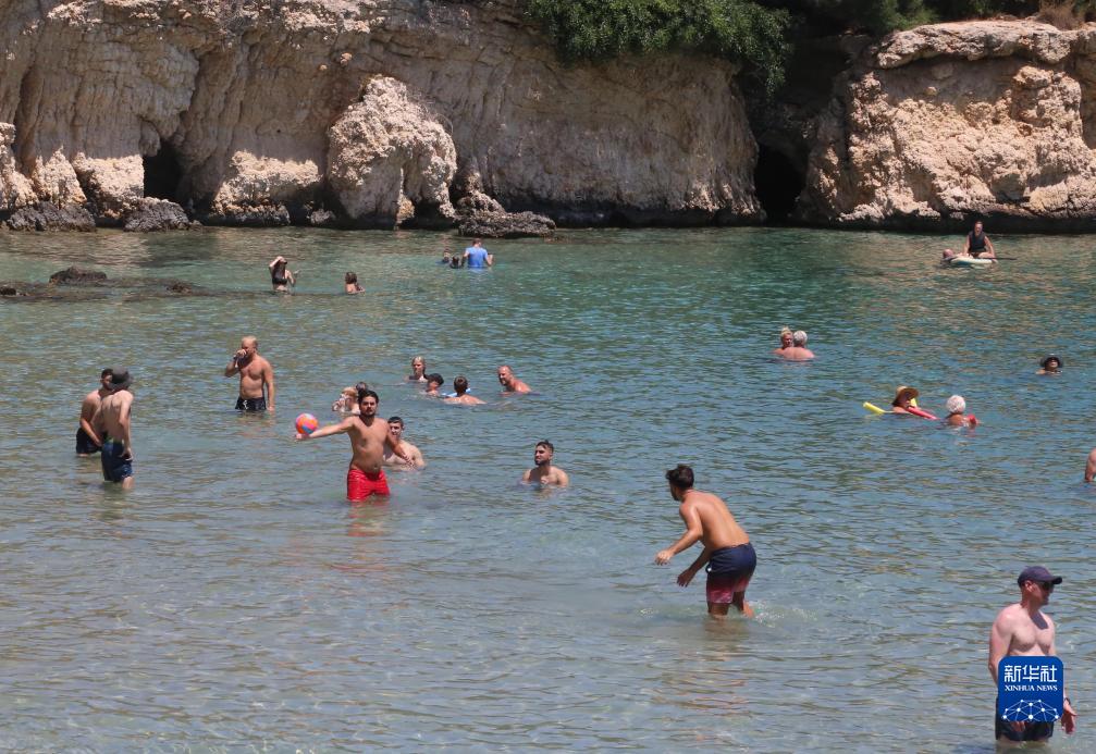 7月14日,人們在塞浦路斯普羅塔拉斯的海邊消暑。新華社記者 郭明芳 攝