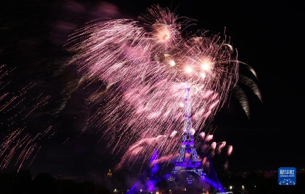 7月14日,焰火在法國巴黎埃菲爾鐵塔周圍綻放。