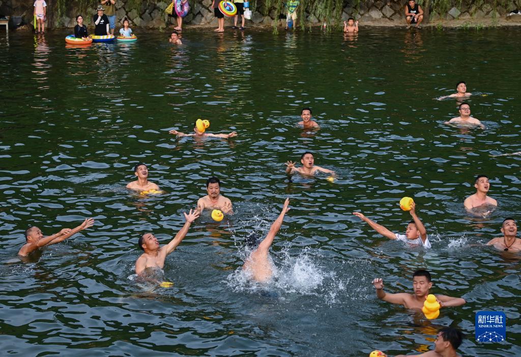 7月14日,游客和村民在乾潭鎮下包村胥溪天然泳場戲水,感受夏日清涼。